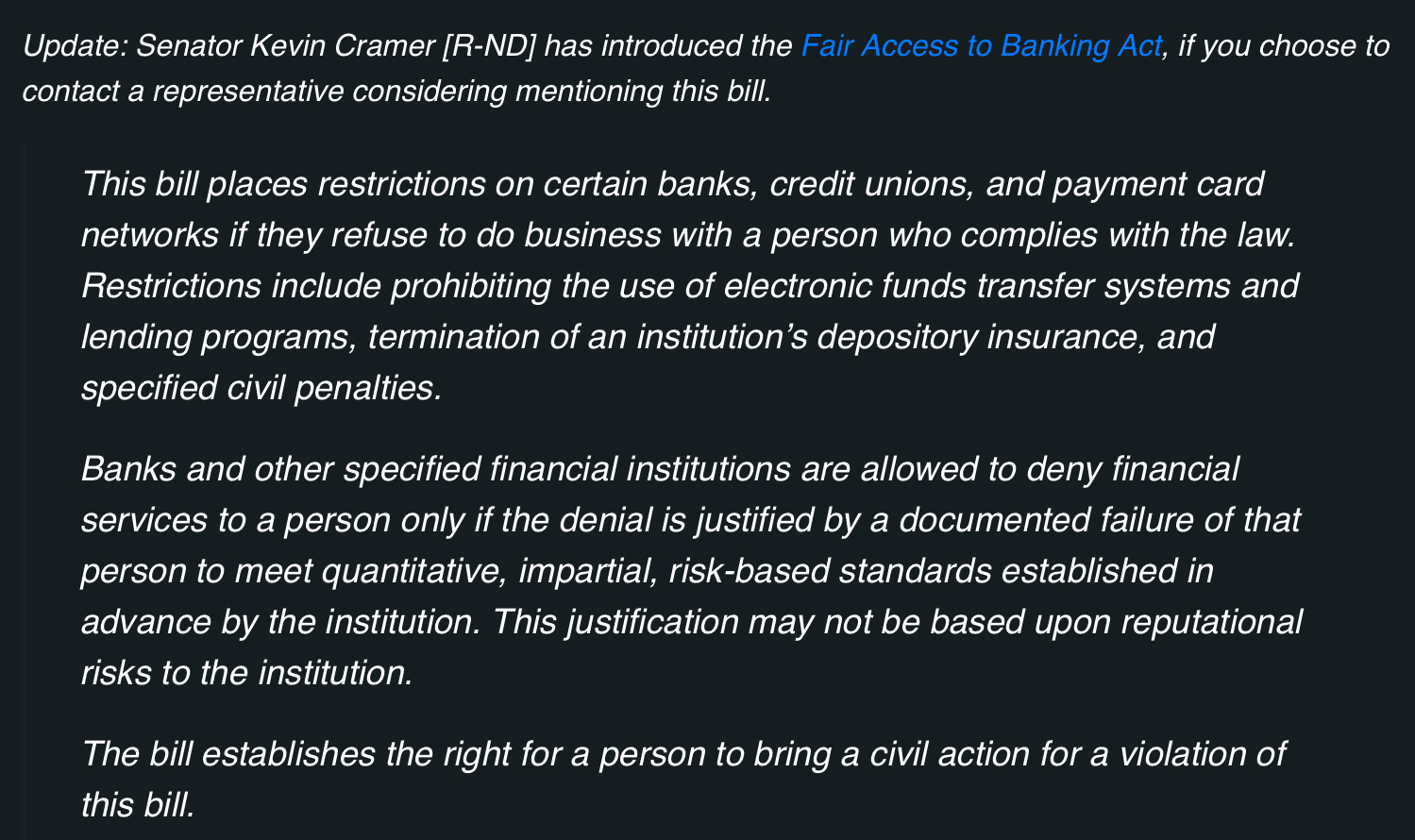Hey, there is an American bill going through called the Fair Access to Banking Act, and it basically makes all this visa and mastercard shit illegal in the US. The bill hasn't arrived to Congress yet, but it is currently a executive order by the current president Trump, ironically enough. Spread the word.